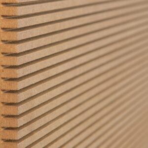 MDF Buigbaar is voorzien van diepe groeven aan één zijde van de plaat, hierdoor is het mogelijk de plaat te buigen en van een gewenste ronding te voorzien. Met de standaard voordelen die MDF van zichzelf al heeft, geeft deze buigzame plaat een extra dimensie aan de mogelijkheden van het MDF.